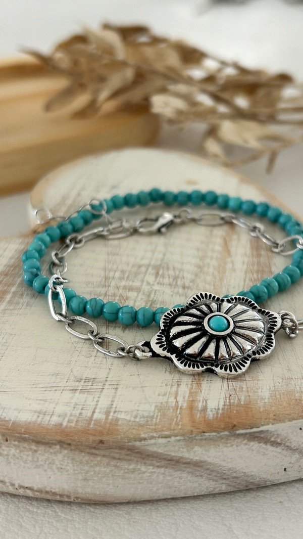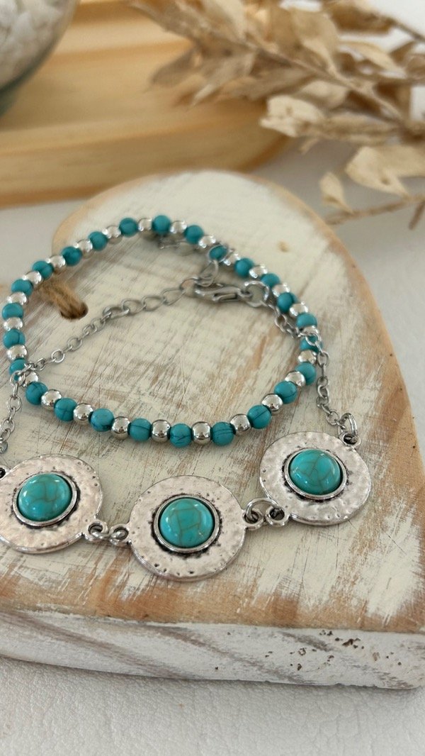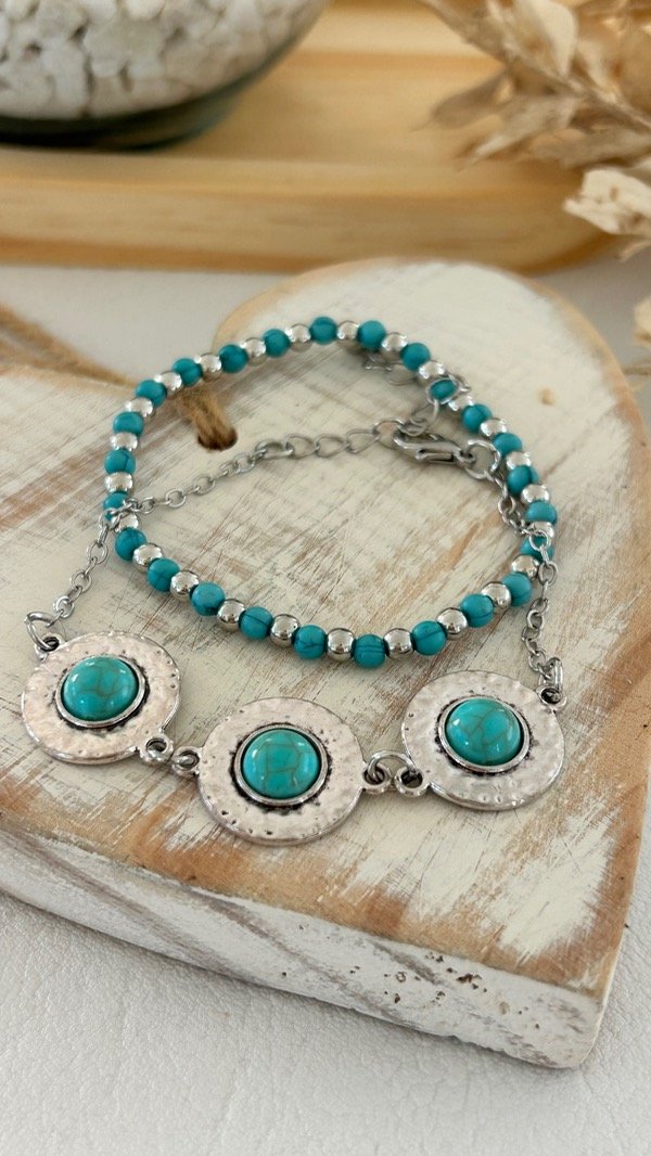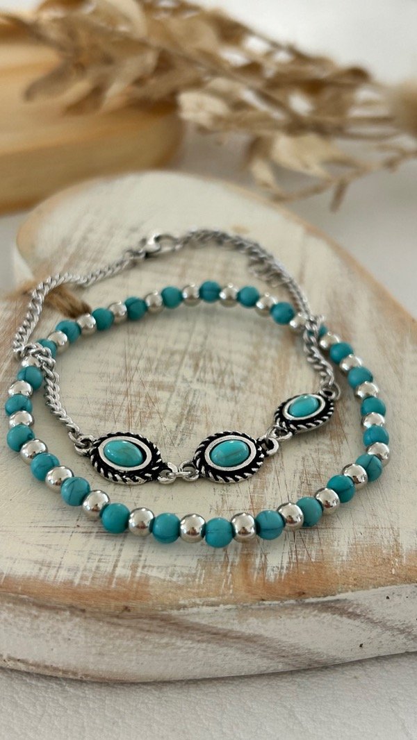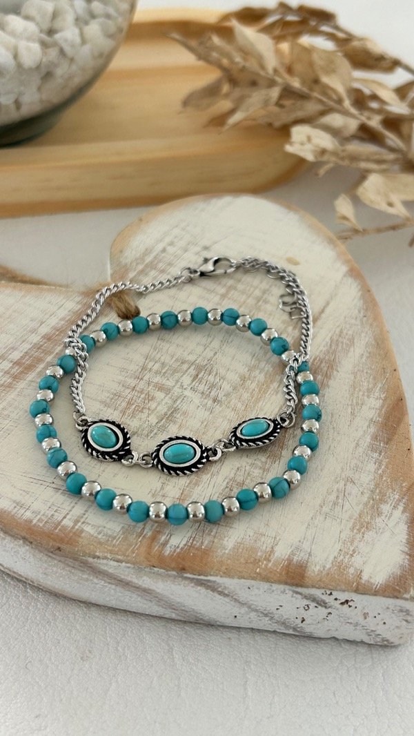 PULSERAS BOHO STYLE ALEACCION Y PIEDRA SINTETICAS, DUO PULSERA ELASTICA MAS PULSERA DIJE CON CADENA