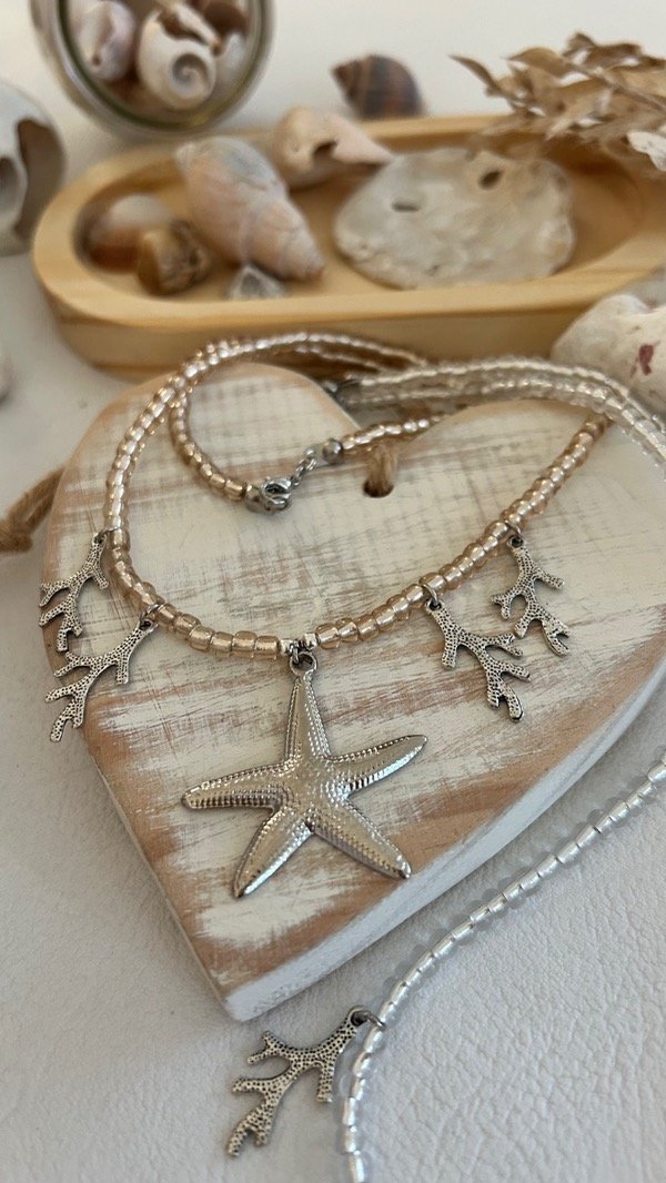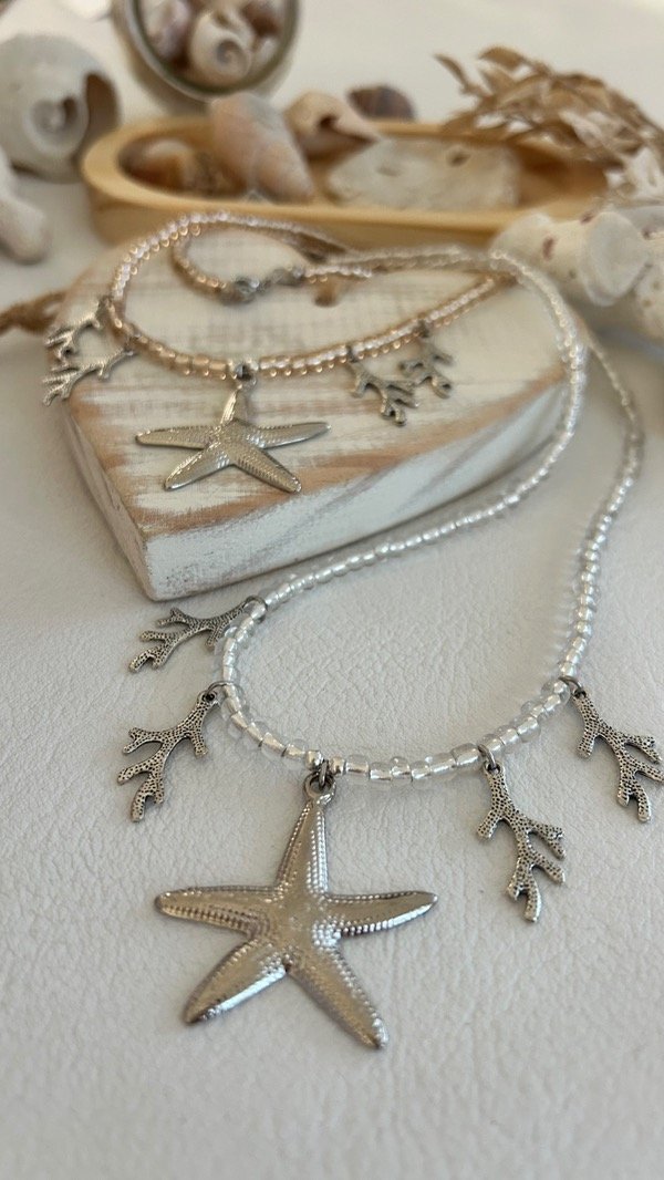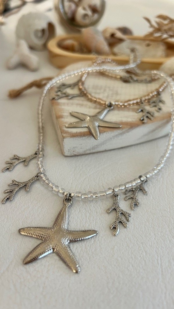 COLLAR MOSTACILLONES TRASLUCIDOS, DIJES ESTRELLA DE MAR Y CORALITOS