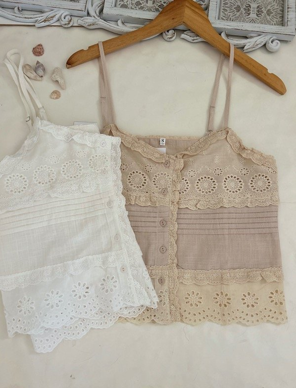 MUSCULOSA LINO ABOTONADA CON TABLITAS, BODERIE Y PUNTILLAS DE ALGODON